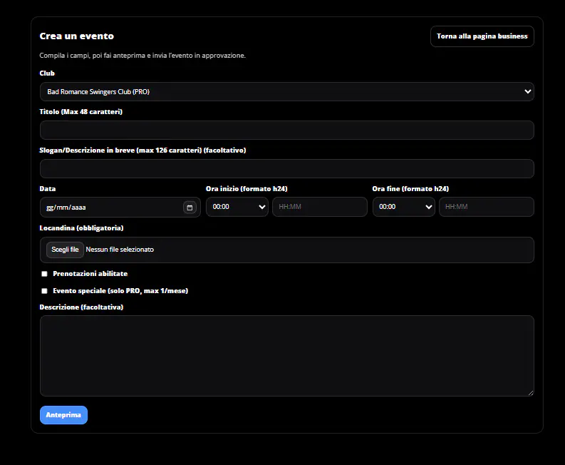 Il Lato Oscuro del Sesso ha deciso di offrire gratuitamente, a tutti i profili che hanno una pubblicazione (locali) sul nostro sito, anche la possibilità di pubblicare eventi e pubblicizzare serate a tema, sconti speciali per una specifica data, ma anche prenotazioni per stabilire un contatto diretto con i vostri clienti e sapere sempre quale potrebbe essere l’affluenza prevista.